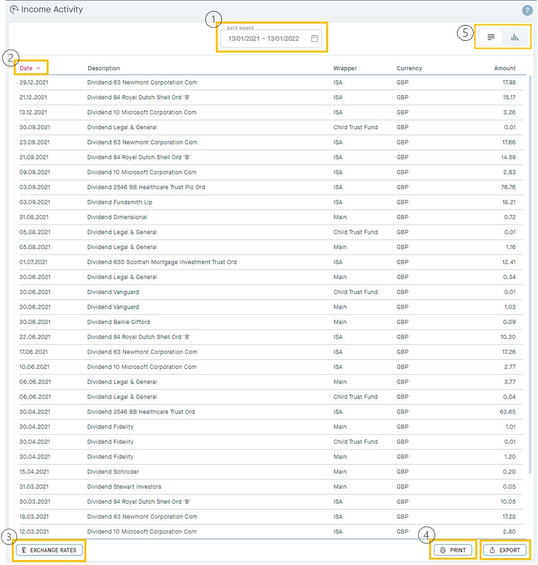 Income activity allows you to see the income received for a given calendar year or tax year, in the form of dividends.